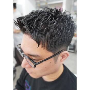 周りはさっぱり刈り上げてアイロンパーマをかけた濡れパンスタイルです!